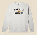 For more than a century, travelers through the high desert have sworn they’ve seen strange orbs of light dancing on the horizon. Some call them headlights, some say mirages - locals know them as the Marfa Lights. This crewneck is our nod to those sightings: a mid weight fleece stamped with Take a Trip and Marfa C.C., with a UFO emblem at center. Built like the classic warm-up gear of a country club that never quite existed - unless you’ve been out under those lights long enough to believe it.